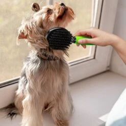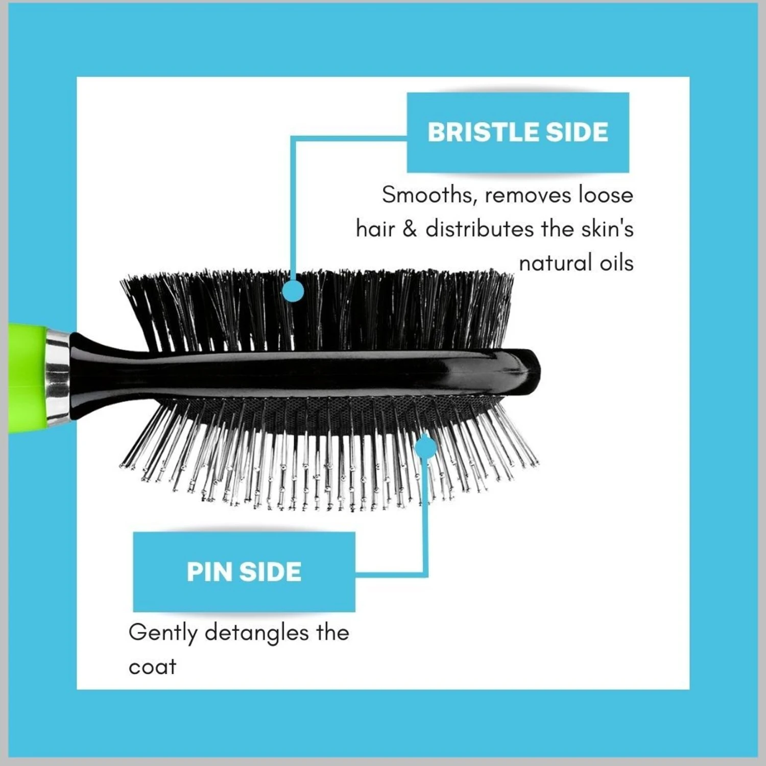 - Includes a side with stainless-steel tips to penetrate your pup’s coat and detangle any mats and a second side with soft bristles to smooth and distribute the skin’s natural oils.