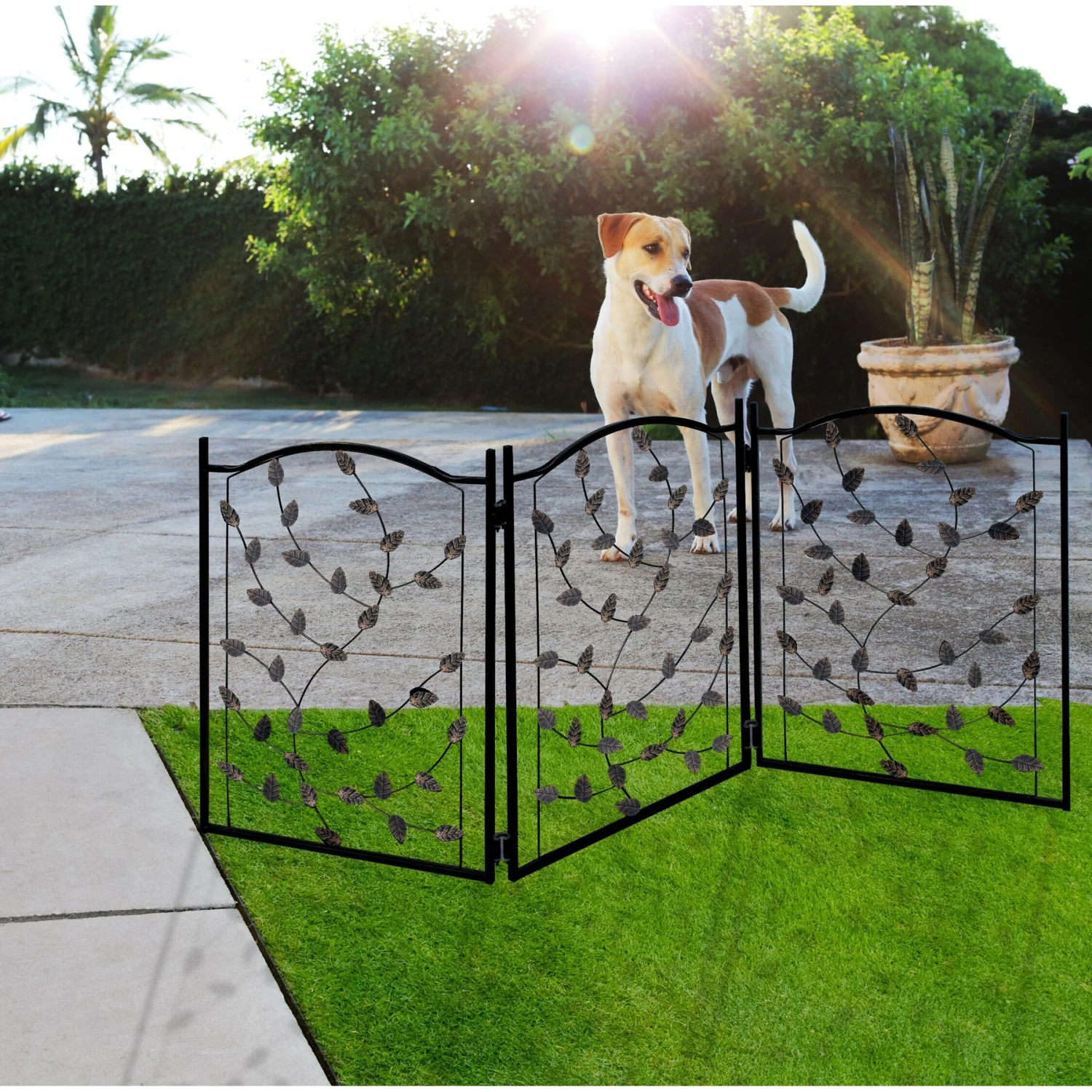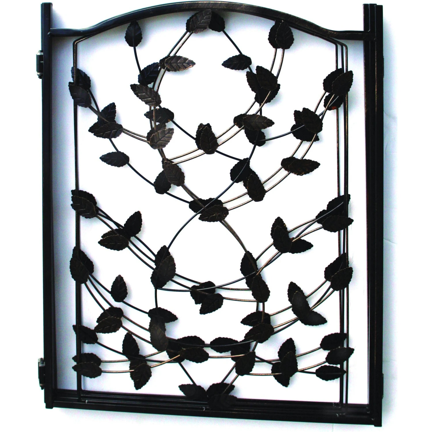 - Elegant metal tri-fold gate with leaf and branch theme.