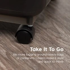 - Store the bin on a shelf, or attach the optional caster wheels to easily roll it from storage to your pet’s food bowl.