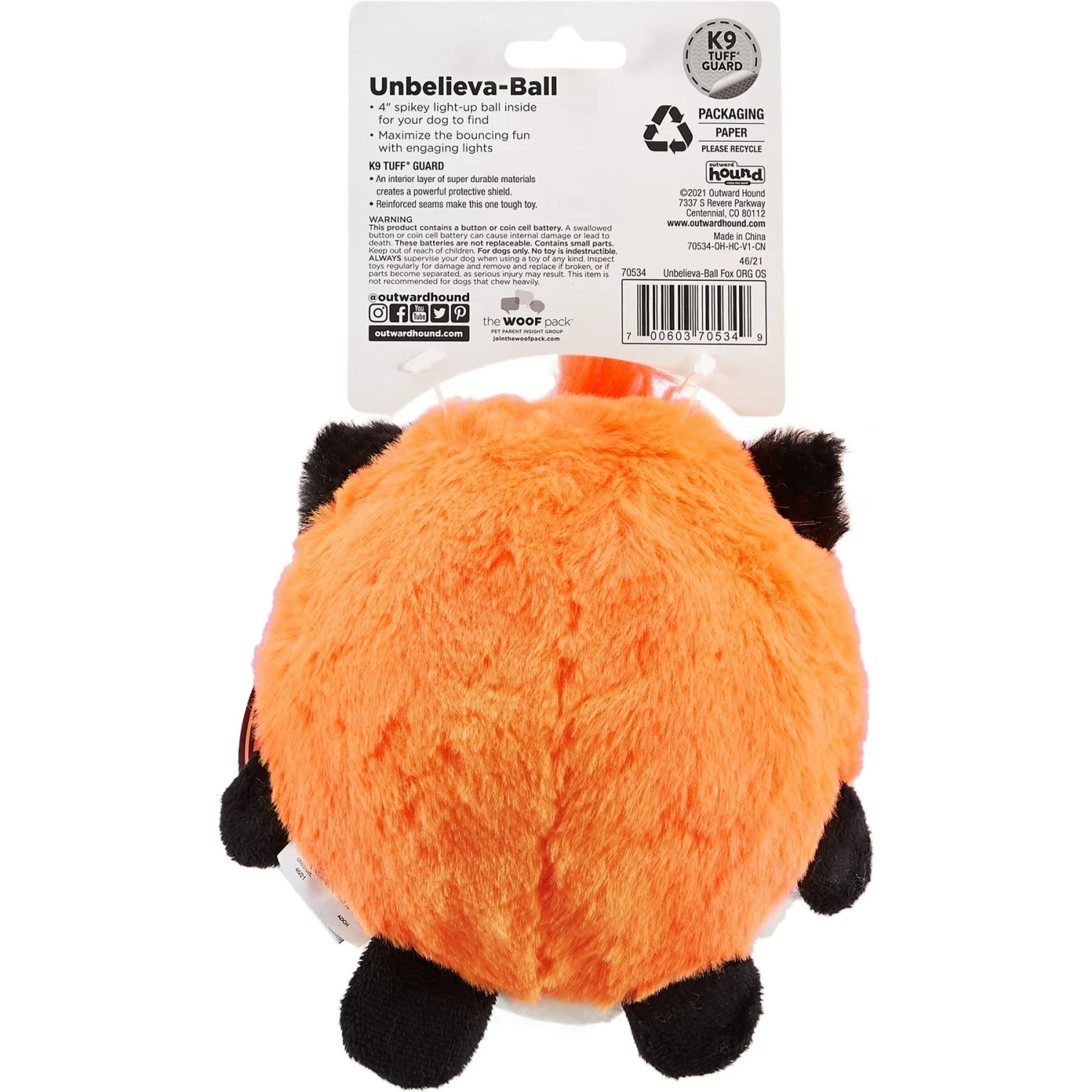 Outward Hound Unbelieva-Ball Fox Interactive Plush Toy With Light Up Dog Ball, Orange