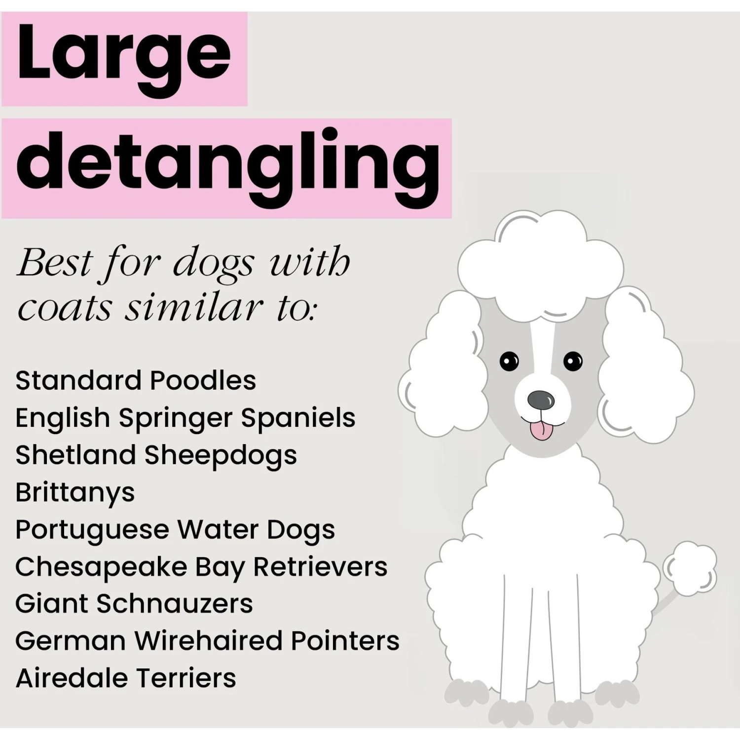 - Gently brushes through knots and tangles to help prevent matting, especially under the stomach and around the legs on light-shedding breeds.